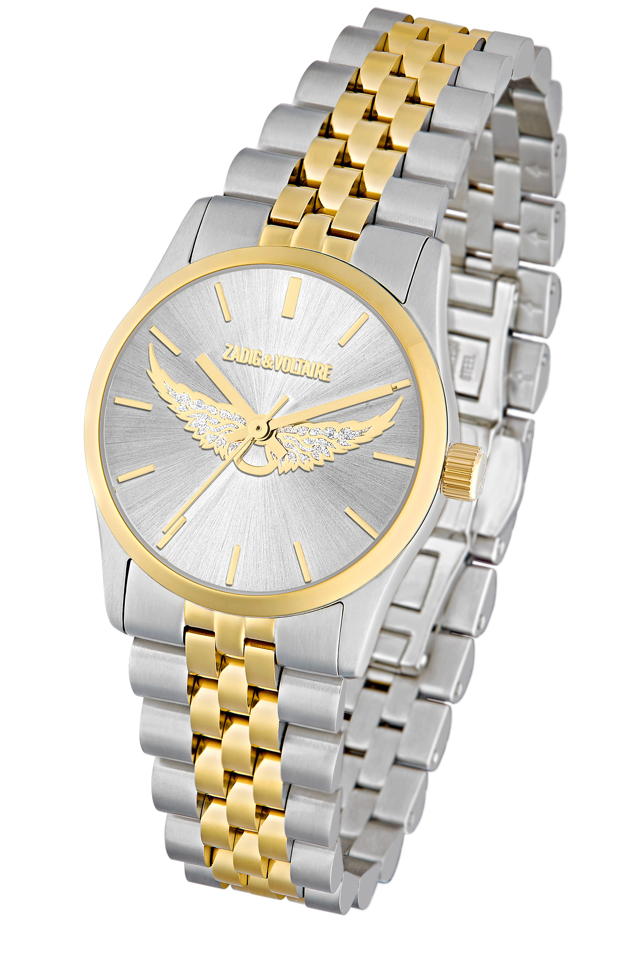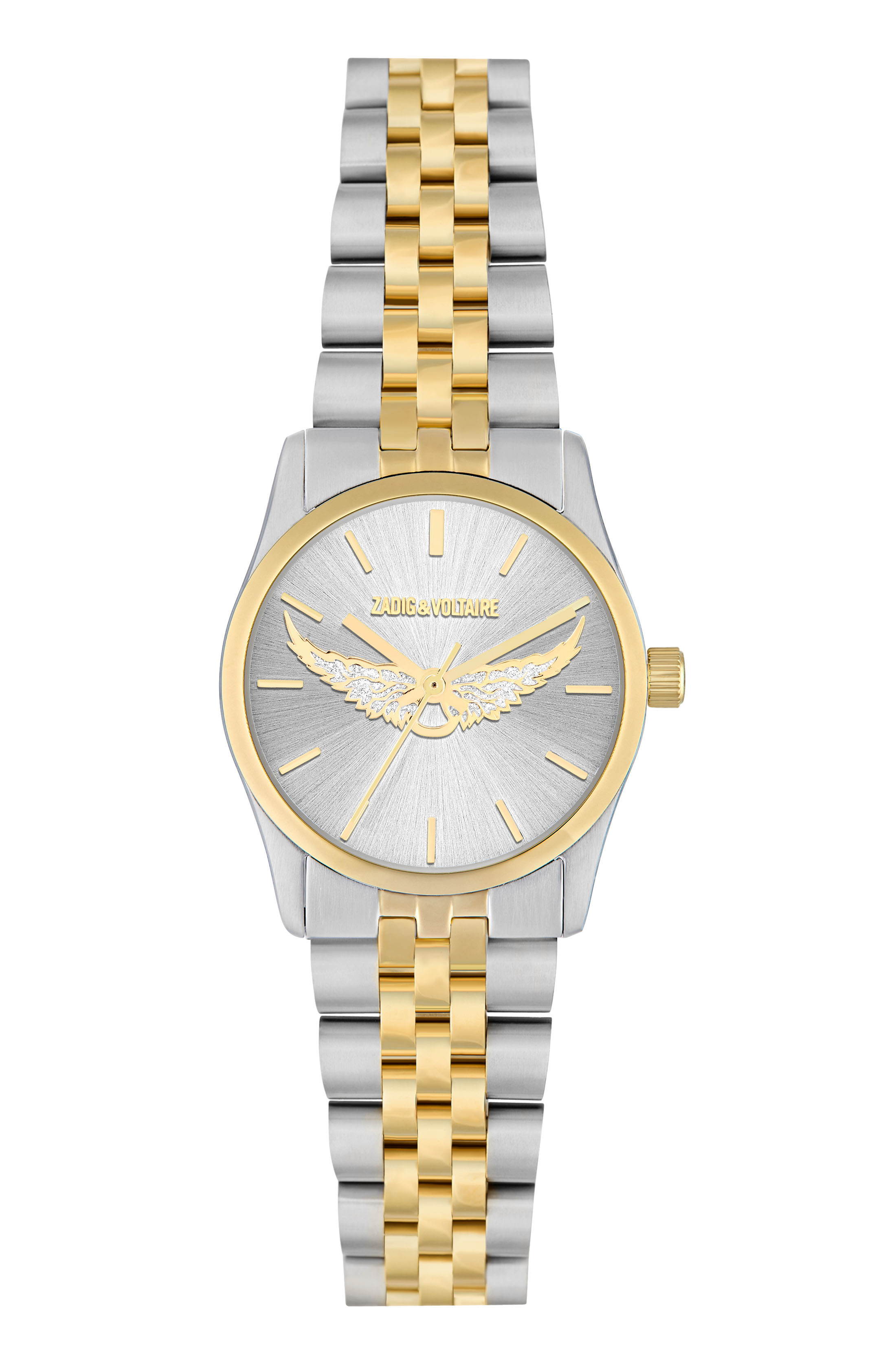 Véritable iconique de la maison Zadig et Voltaire, la montre Fusion modèle BI-COLOR Wings se décline cette saison dans cette version en acier doré et argenté avec une nouvelle maille pour le bracelet, ornée d'un cadran argenté et d'ailes dorées en cristaux gris.