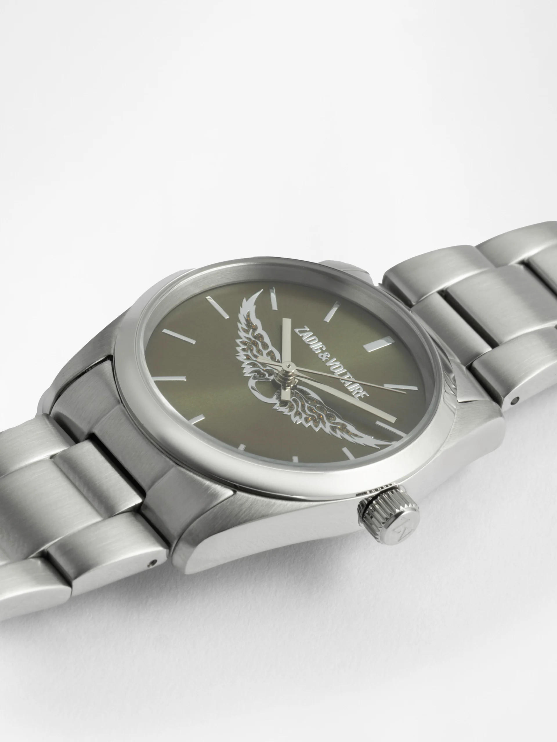 Montre en acier argenté brossé inoxydable de la marque Zadig et Voltaire modèle FUSION 33 KAKI WINGS ZVW1203 cardan fond kaki motif ailes pailletées.
