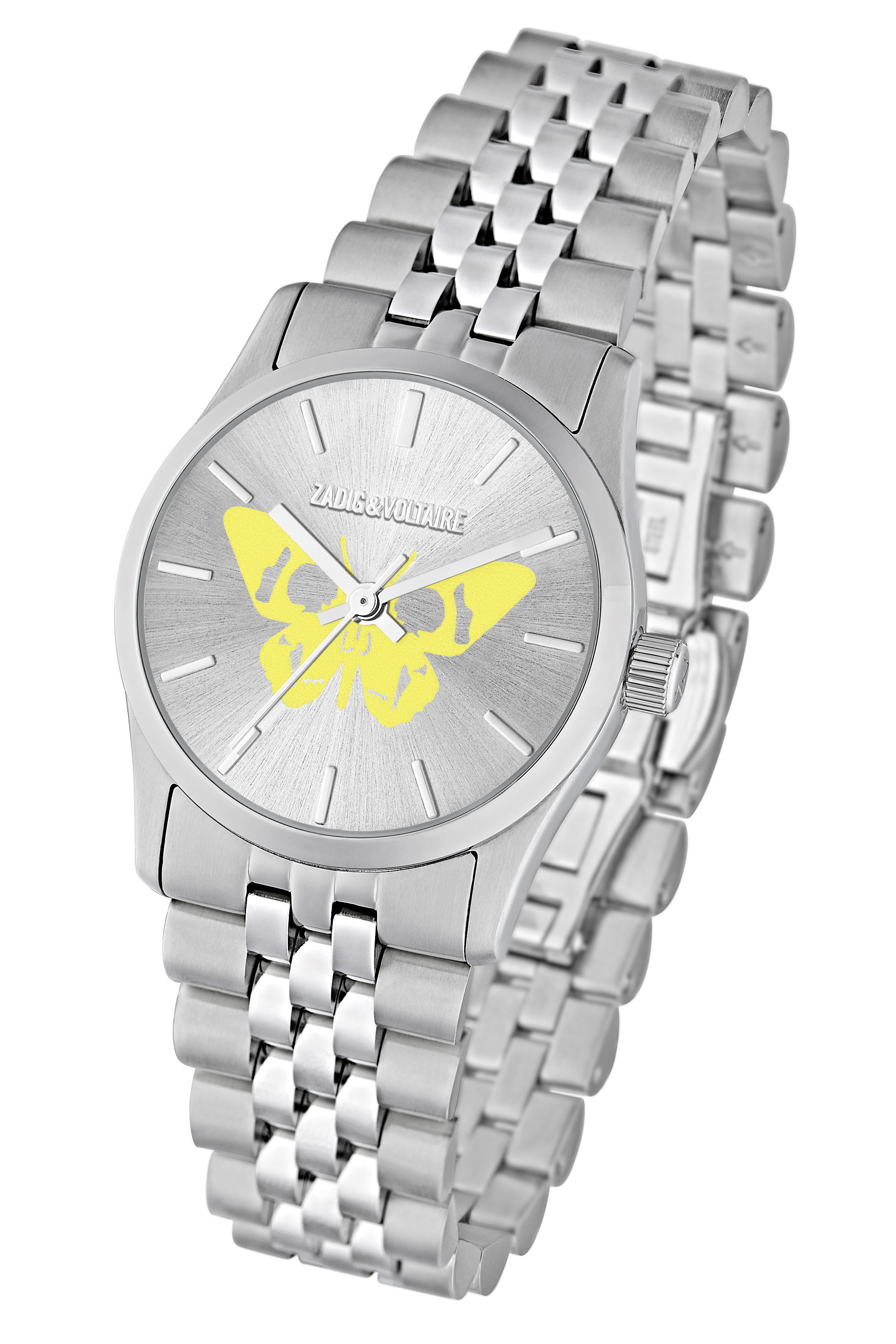 Montre en acier argenté brossé et brillant inoxydable de la marque Zadig et Voltaire modèle PAPILLON YELLOW ZVW1207 cardan fond argenté motif papillon jaune.