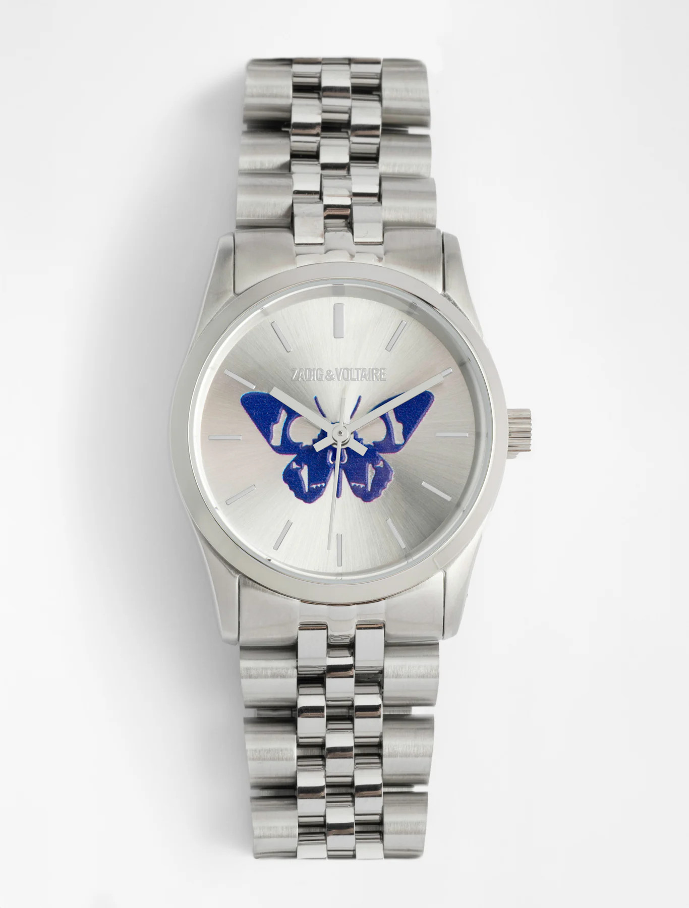 Montre en acier argenté brossé et brillant inoxydable de la marque Zadig et Voltaire modèle 30 SMALL PAPILLON BLEU ZVW1208 cardan fond argenté motif papillon bleu roy.