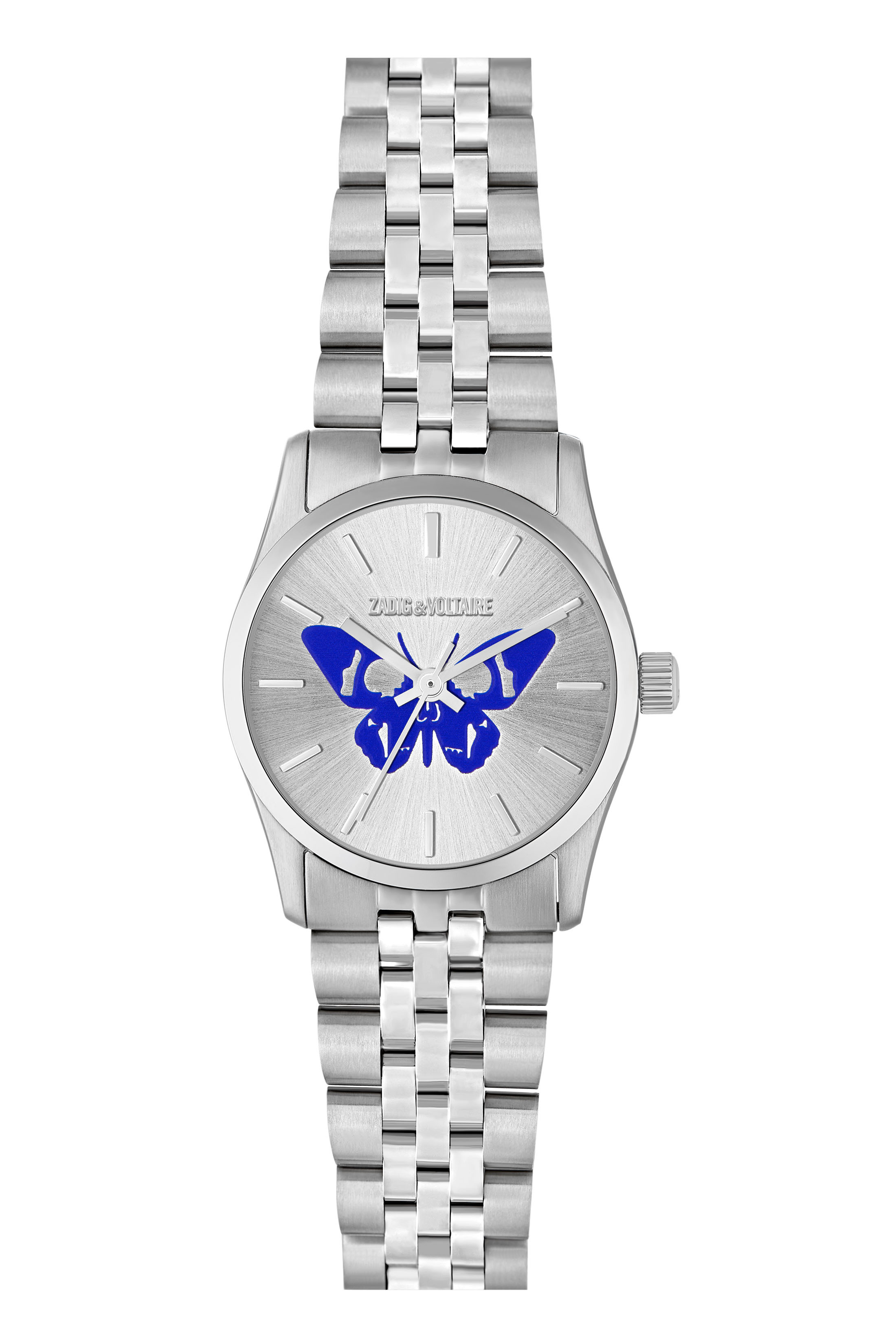 Montre en acier argenté brossé et brillant inoxydable de la marque Zadig et Voltaire modèle PAPILLON BLEU ZVW1208 cardan fond argenté motif papillon bleu roy.