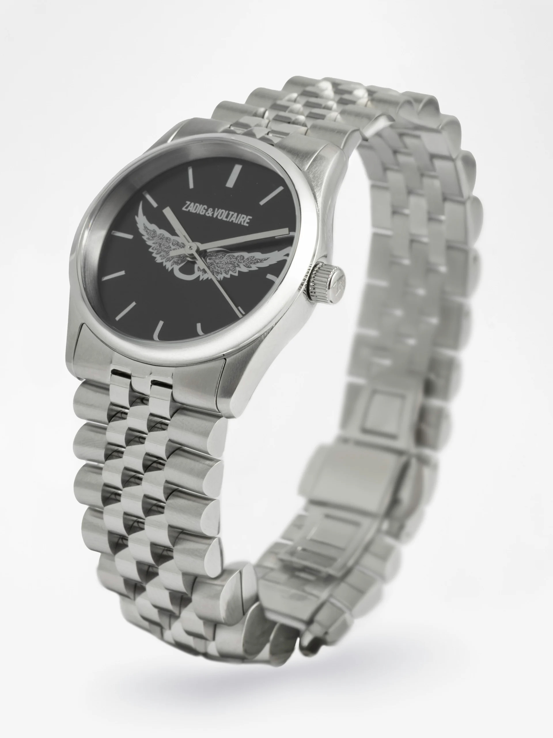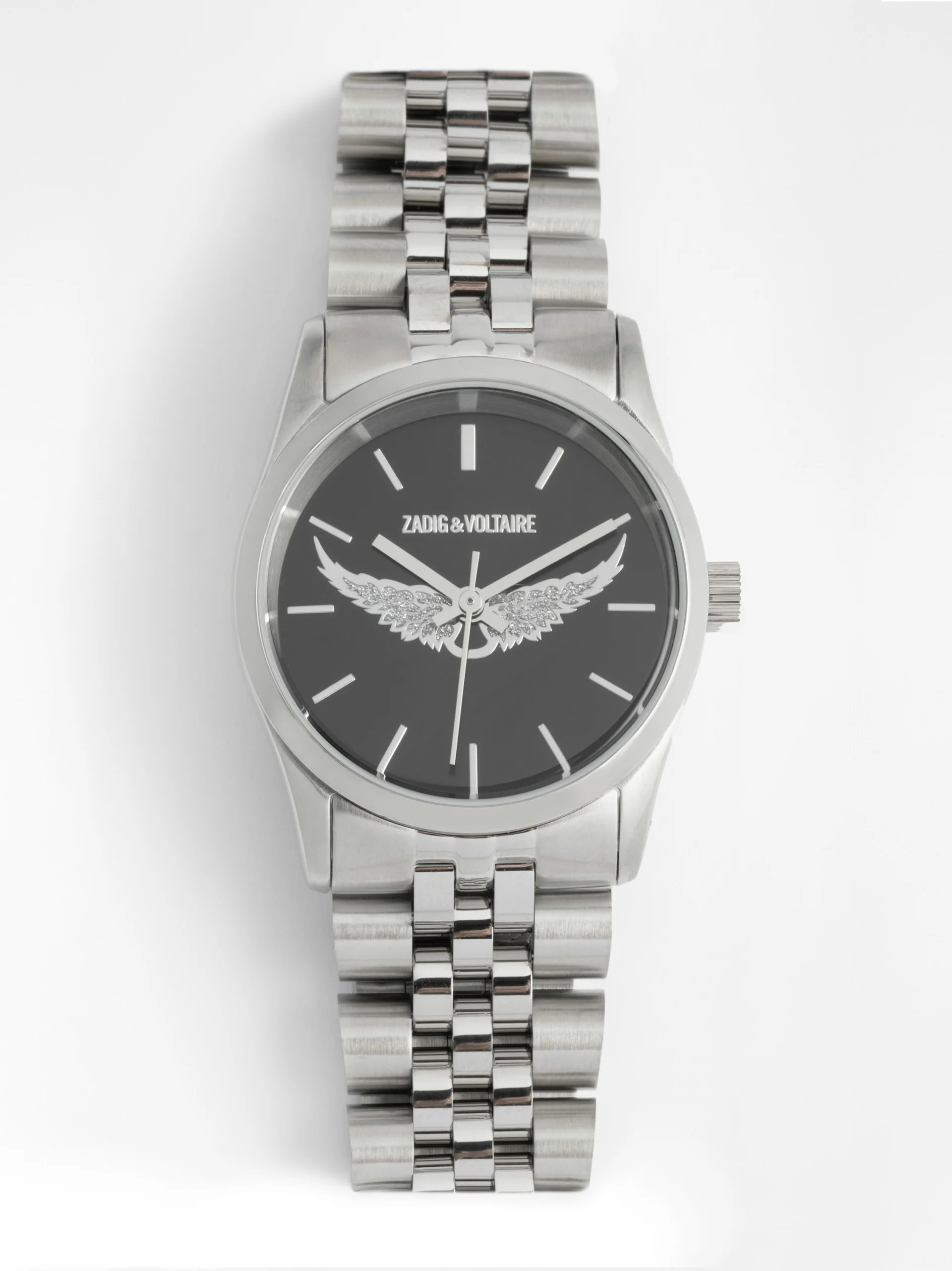 Montre en acier argenté brossé et brillant inoxydable de la marque Zadig et Voltaire modèle 30 SMALL WINGS BLACK ZVW1206 cardan fond noir motif ailes pailletées.