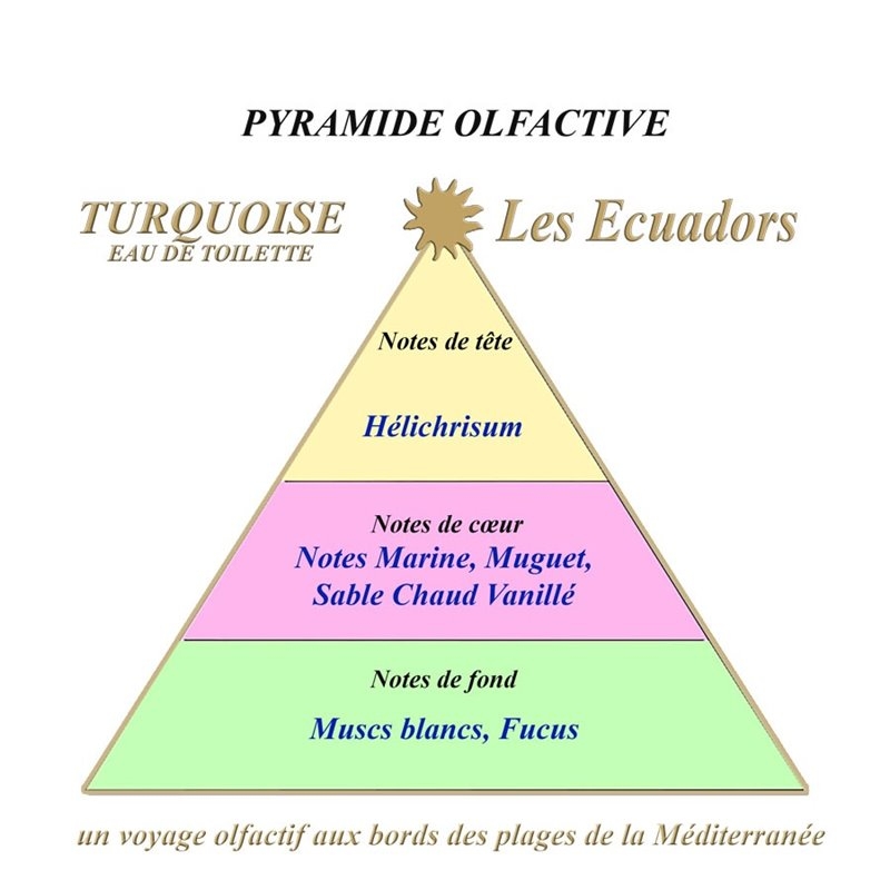 Le parfum TURQUOISE est solaire et lumineux, sa composition évoque un accord marin où le jasmin et la fleur d’oranger se mêlent à un univers aquatique pour finir sur les sables chauds emportés par la vanille et le musc blanc.
