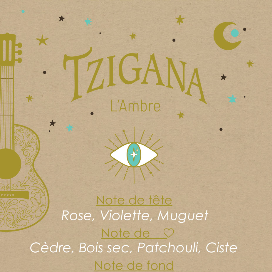 Le parfum Tzigana est une ode à la liberté, aux voyages et rend hommage aux âmes nomades empruntent des parfums rencontrés. Un souffle d'Ambre comme un foulard ancien porté mille fois sous les étoiles, des notes sensuelles avec un lit de bois sec et de patchouli, et en fond la vanille et le benjoin qui réchauffent la peau en lui laissant une trace magnétique. Tziganan. c'est comme un bijou oublié au creux du cou, une senteur mystique, chaude et inoubliable.