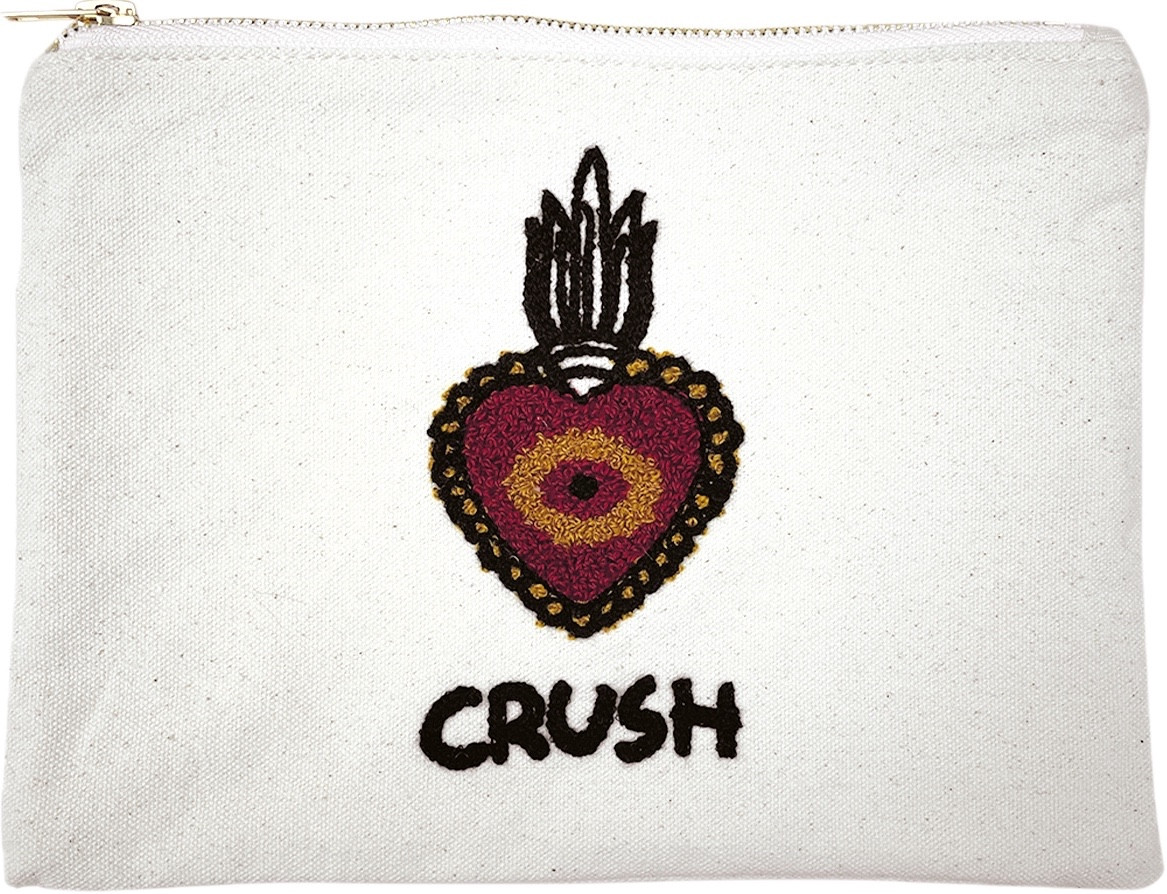 Trousse CRUSH en coton blanc avec un message effet bouclette noir et un ex-voto rouge porte-bonheur.
