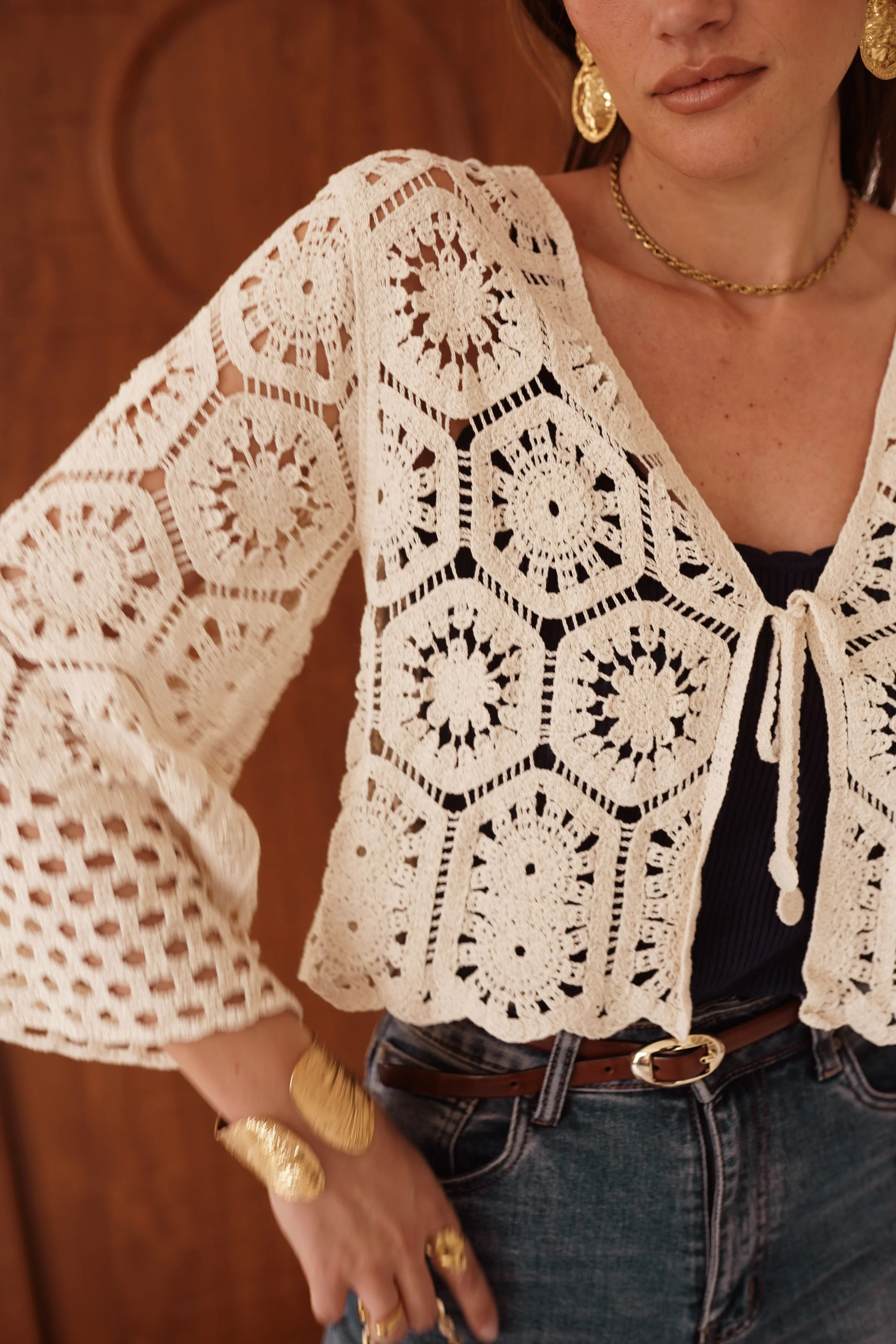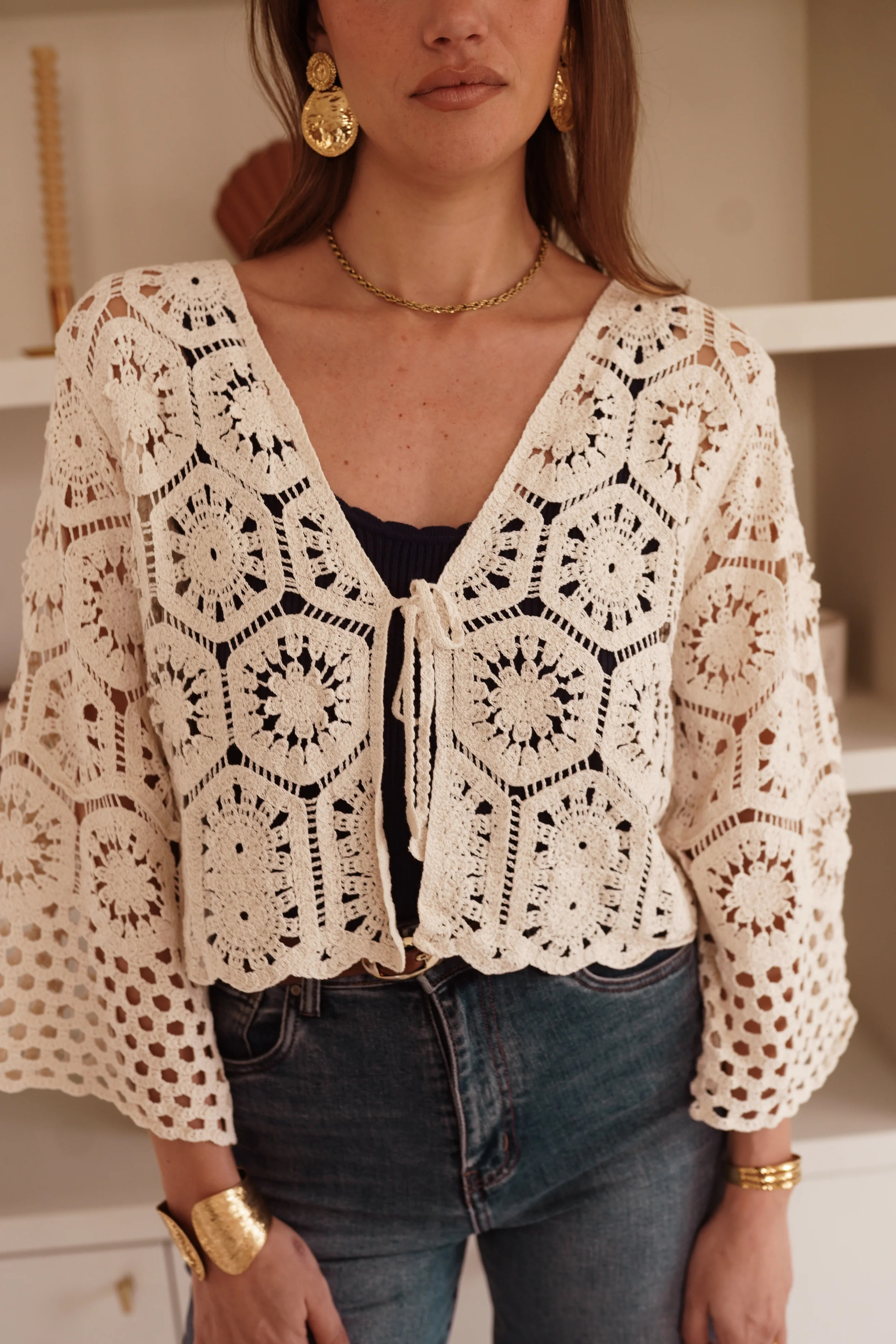 Vous allez adorer ce ravisant Gilet Charlène au crochet couleur crème, aux motifs graphiques travaillés, avec une coupe courte, des manches évasées et un lien à nouer sur le devant. Ce gilet est parfait pour mettre avec un top ou une robe sans manches.