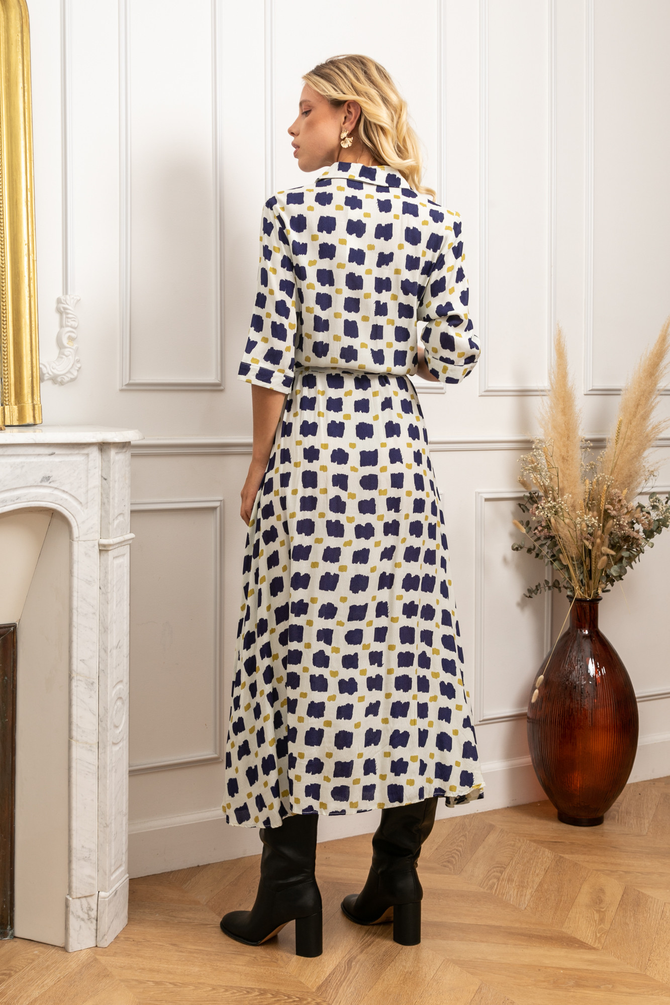 Vous allez craquer pour cette jolie robe chemise ANDREANI fond blanc à l'imprimé marine et moutarde qui vous assurera une look élégant et tendance que ce soit avec une paire de baskets ou des bottines.