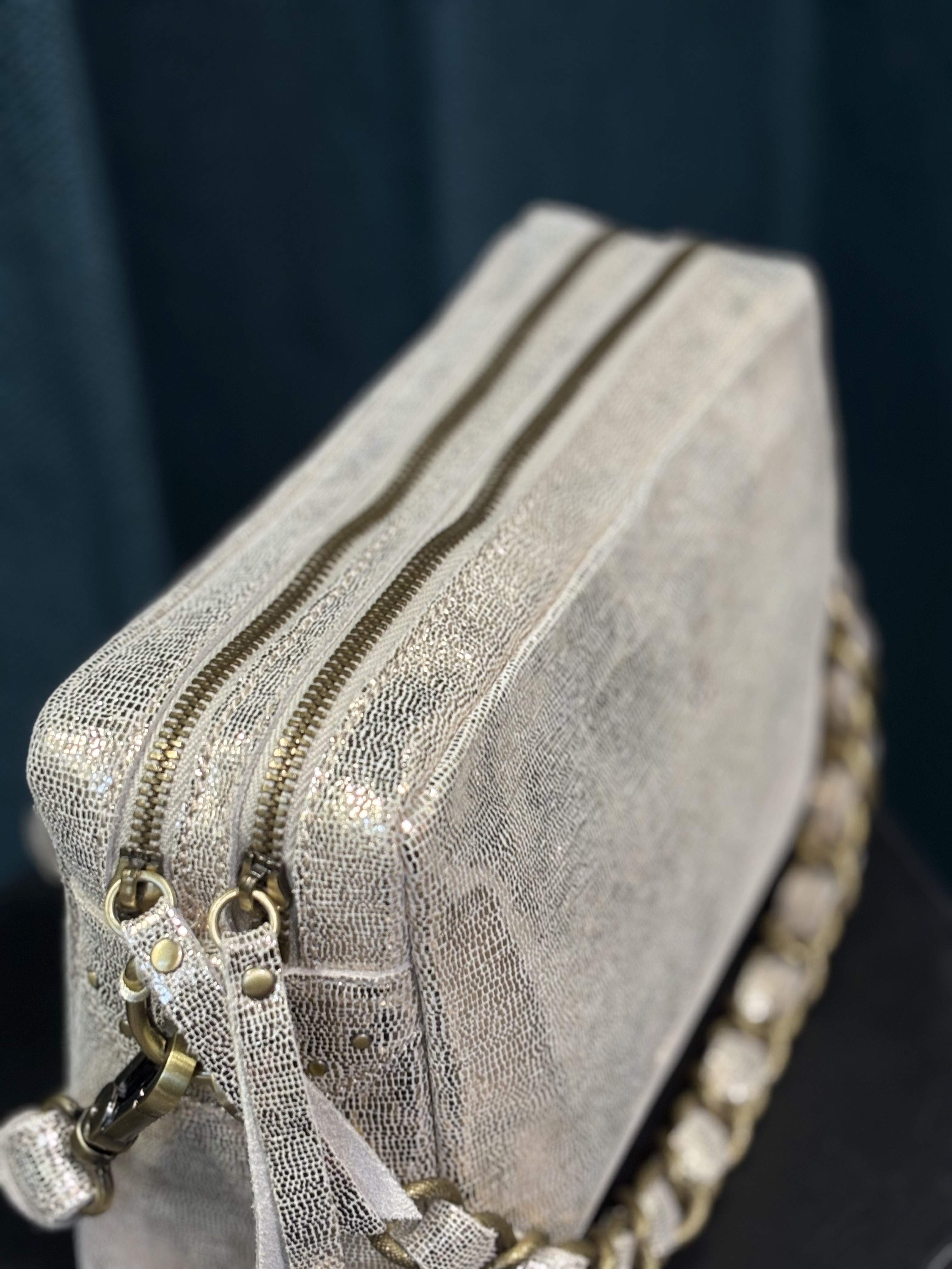 Sac MILA LOUISE modèle MAMA LRX LATTÉ en cuir sparkle doré clair effet écaille.