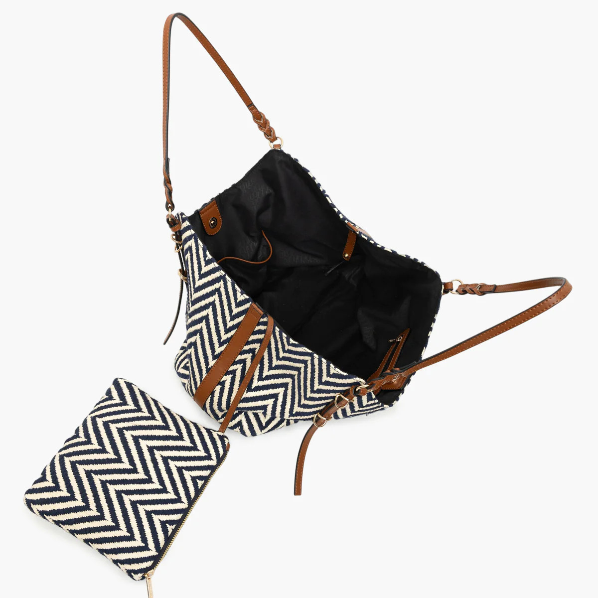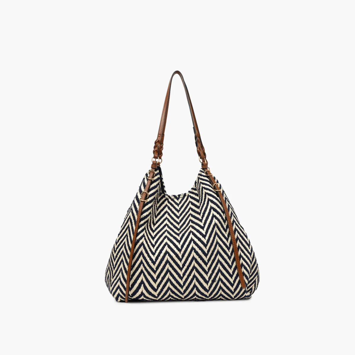 Craquage assuré pour le superbe grand sac shopper RINGO MARINE composé d'une belle toile imprimé chevrons marine et beige, porté épaule grâce à ses deux anses plates couleur camel.