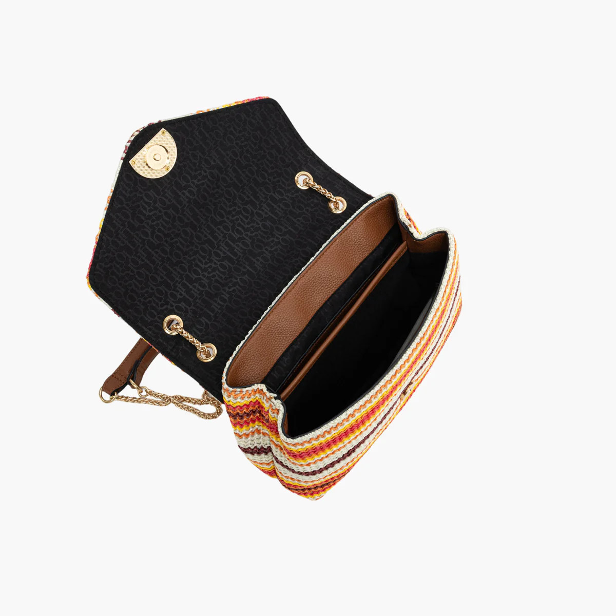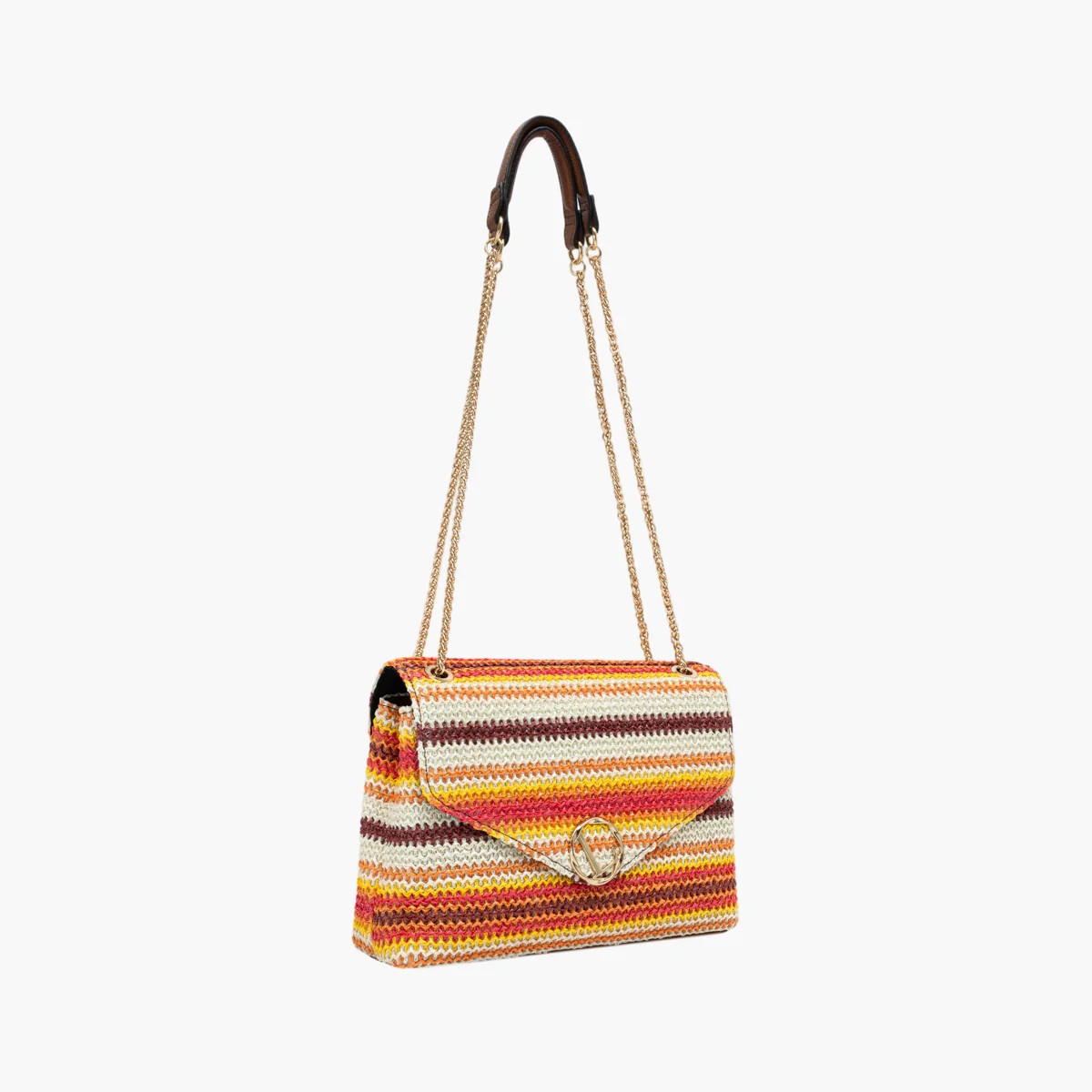 Coup de coeur pour ce ravissant sac SARTENE porté épaule au format compact et à l'allure folle, réalisé dans un tissu rayé effet paille tressé aux tons lumineux et contrastés.