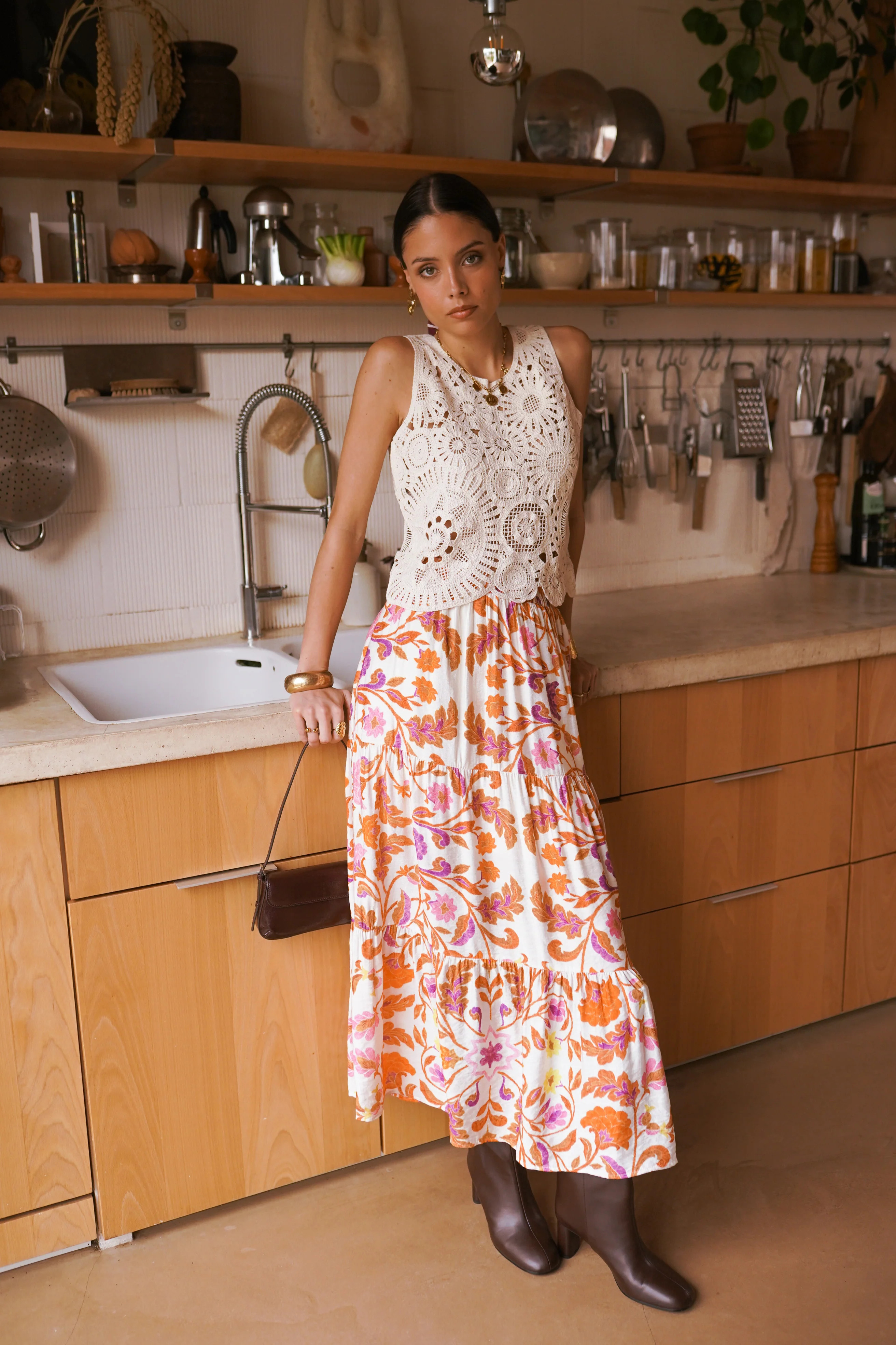 Vous allez adorer ce ravisant top Charlie au crochet couleur crème, aux motifs floraux et de rosaces avec une finition festonnée sur le bas.